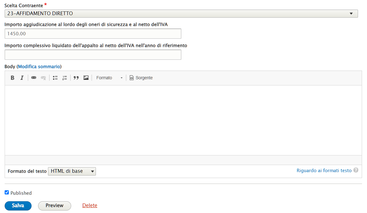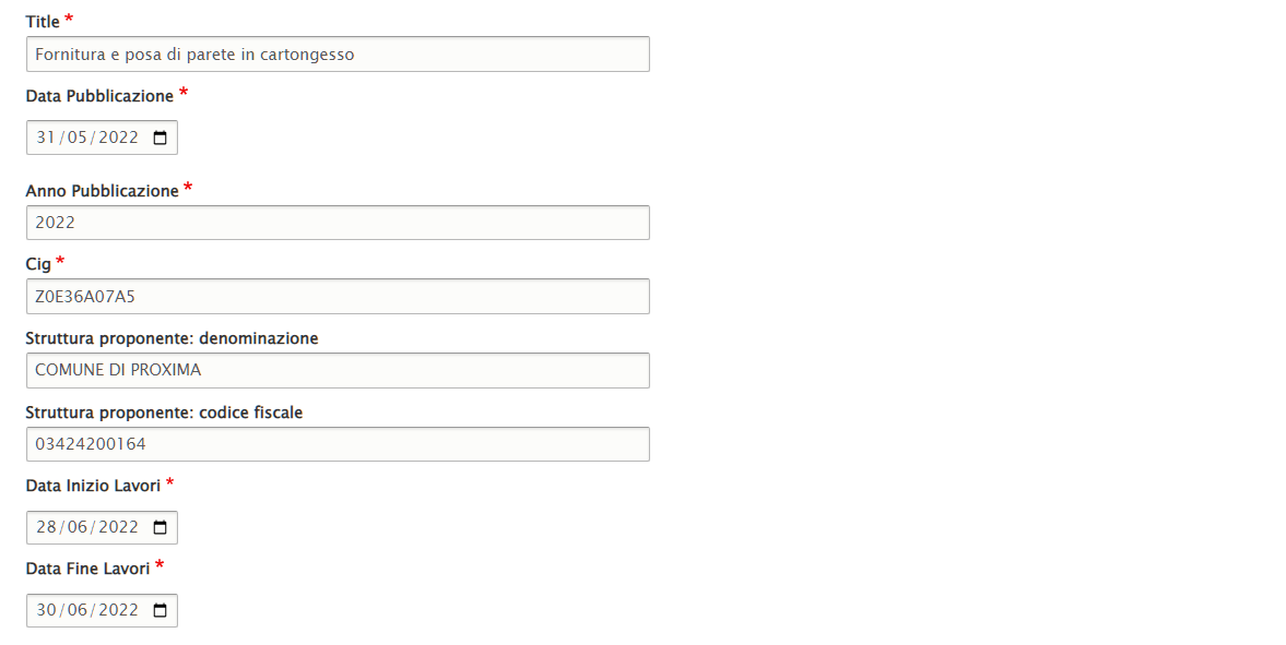 Questo contenuto permette di caricare i dati relativi alla pubblicazione obbligatoria assolvimento degli obblighi di pubblicazione e di trasmissione delle informazioni