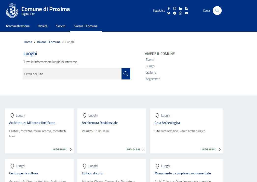 Questo contenuto permette di creare pagine dedicate ai luoghi di interesse, quali musei, biblioteche, reperti archeologici, palazzi storici o elementi naturali del proprio comune che verranno pubblicate