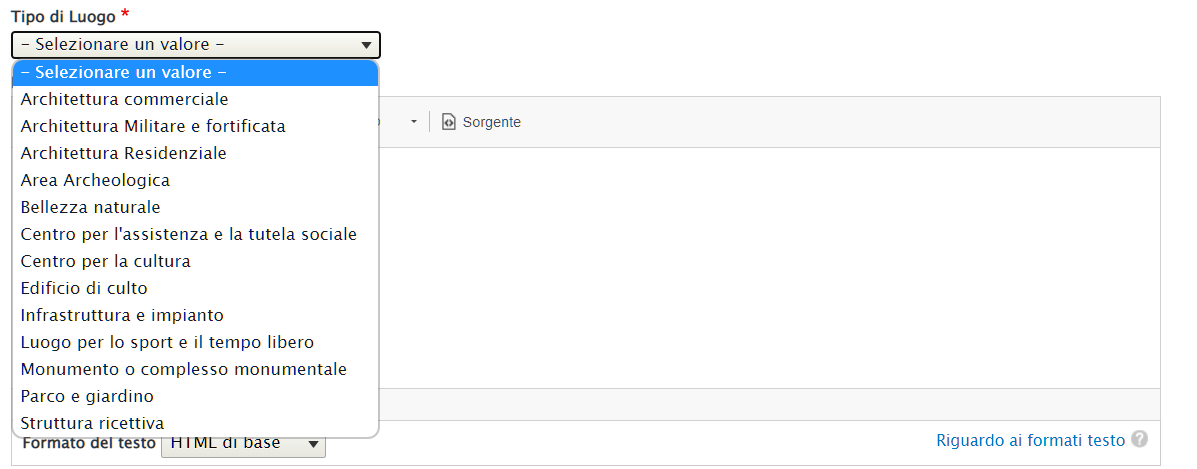Selezionare dal menù a discesa la tipologia di luogo.