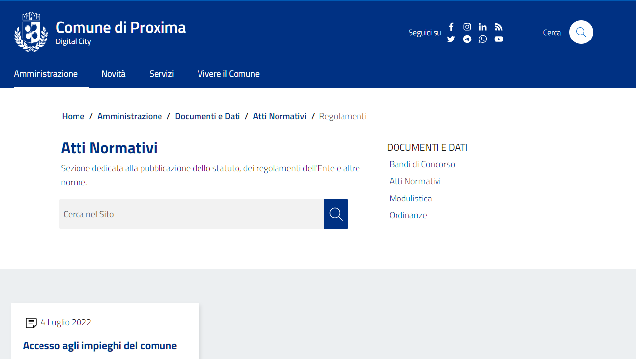 Questo contenuto permette il caricamento dei Regolamenti nella sezione Documenti e Dati sotto la voce "Amministrazione" del menù principale.