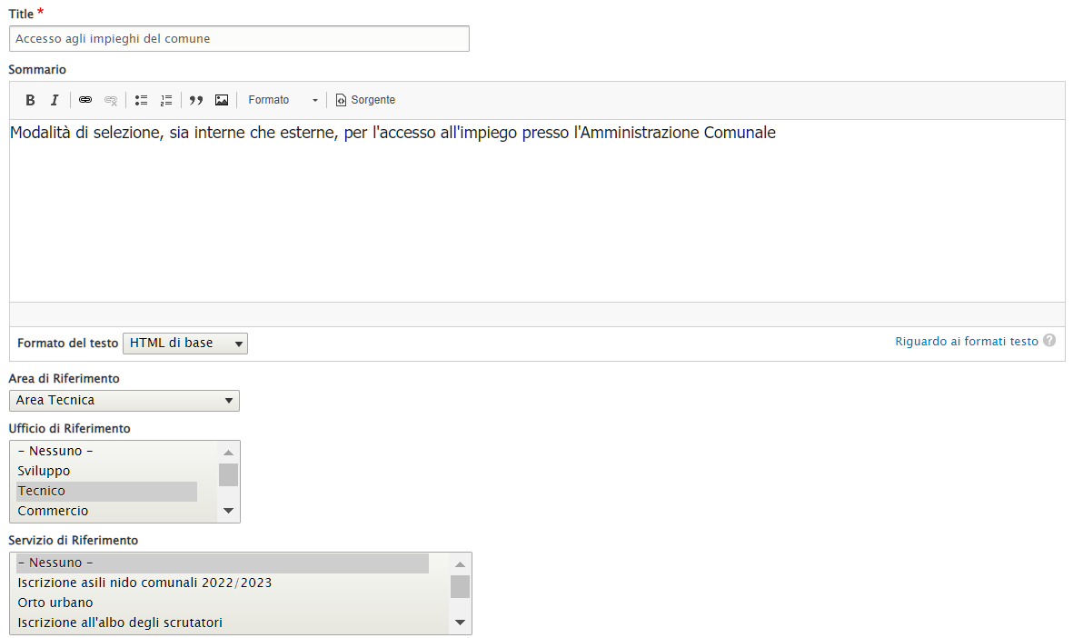 Inserire il nome del regolamento, il sommario e scegliere dal menu a discesa tutti gli uffici o servizi a cui fa riferimento.